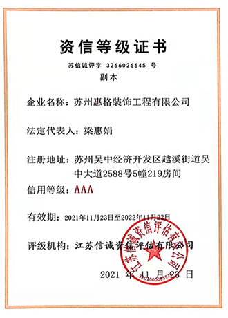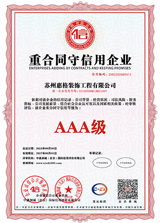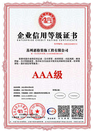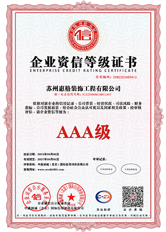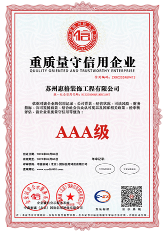 苏州惠格装饰工程有限公司成立于2016年8月12日,注册资金壹仟捌佰万元,是具有建筑工程施工总承包叁级、建筑装修装饰工程专业承包贰级与消防设施工程专业承包贰级资质的企业。主要经营范围包括室内外装饰装潢工程、建筑幕墙工程、建筑智能化工程、消防工程、市政工程、环保工程、园林景观绿化工程、园林古建筑工程、机电设备安装工程、建筑工程的设计与施工;建筑工程项目咨询;销售:建筑材料。
