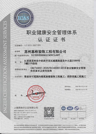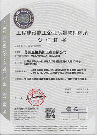 苏州惠格装饰工程有限公司成立于2016年8月12日,注册资金壹仟捌佰万元,是具有建筑工程施工总承包叁级、建筑装修装饰工程专业承包贰级与消防设施工程专业承包贰级资质的企业。主要经营范围包括室内外装饰装潢工程、建筑幕墙工程、建筑智能化工程、消防工程、市政工程、环保工程、园林景观绿化工程、园林古建筑工程、机电设备安装工程、建筑工程的设计与施工;建筑工程项目咨询;销售:建筑材料。